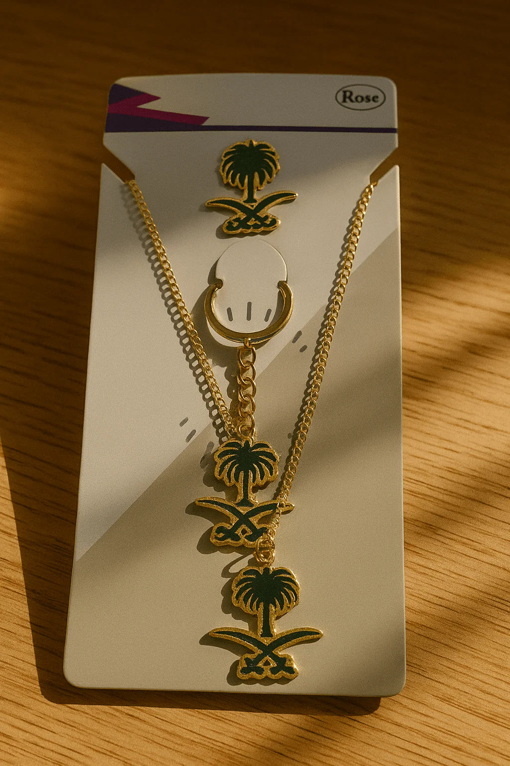 احتفلي بروح المملكة العربية السعودية مع طقم مجوهرات اليوم الوطني السعودي ، المصمم بألوان خضراء وذهبية أنيقة ترمز إلى الفخر والتراث. يضم هذا الطقم قطعًا مصنوعة بإتقان، مثالية لأزياء النساء، والفعاليات الثقافية، والاحتفالات المدرسية، والمناسبات الخاصة . يتميز بخفة وزنه وأناقته، ويضيف لمسة من الرقي إلى إطلالتكِ في اليوم الوطني، معبرًا عن حبكِ للمملكة.